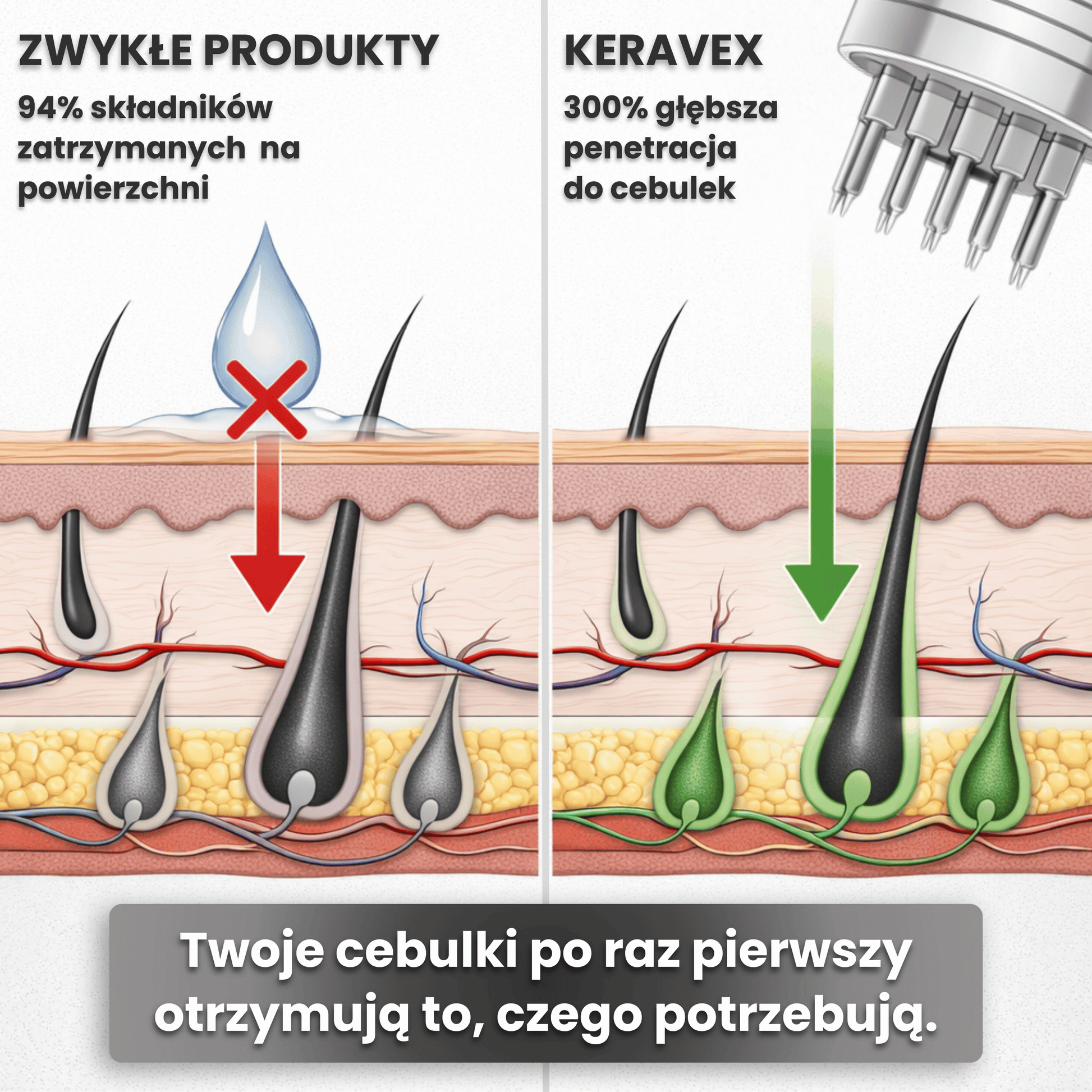 System Mikro Infuzji KERAVEX to produkt w swojej klasie. Łącząc zaawansowaną technologię dostarczania składników z aktywnymi substancjami stymulującymi wzrost, wypełnia lukę między codzienną pielęgnacją a profesjonalnymi zabiegami. To złoty standard dla każdego, kto poważnie podchodzi do odzyskania gęstości włosów w domu.